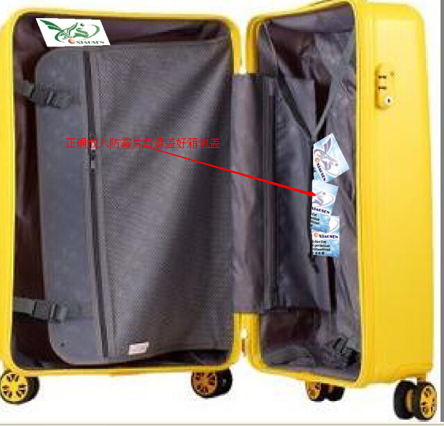 2)蓋好箱蓋后,因箱包外套PE袋或者外箱(紙盒),可以在PE袋子內(nèi)(或紙盒)內(nèi)也放置兩到三片防霉片,可預(yù)防箱包在倉儲或者海上長時運輸發(fā)霉長斑。
