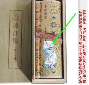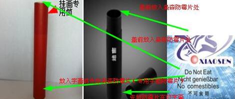 2):在字畫(huà)專(zhuān)用筒底部和上部同時(shí)放入梟森防霉片后蓋好盒蓋